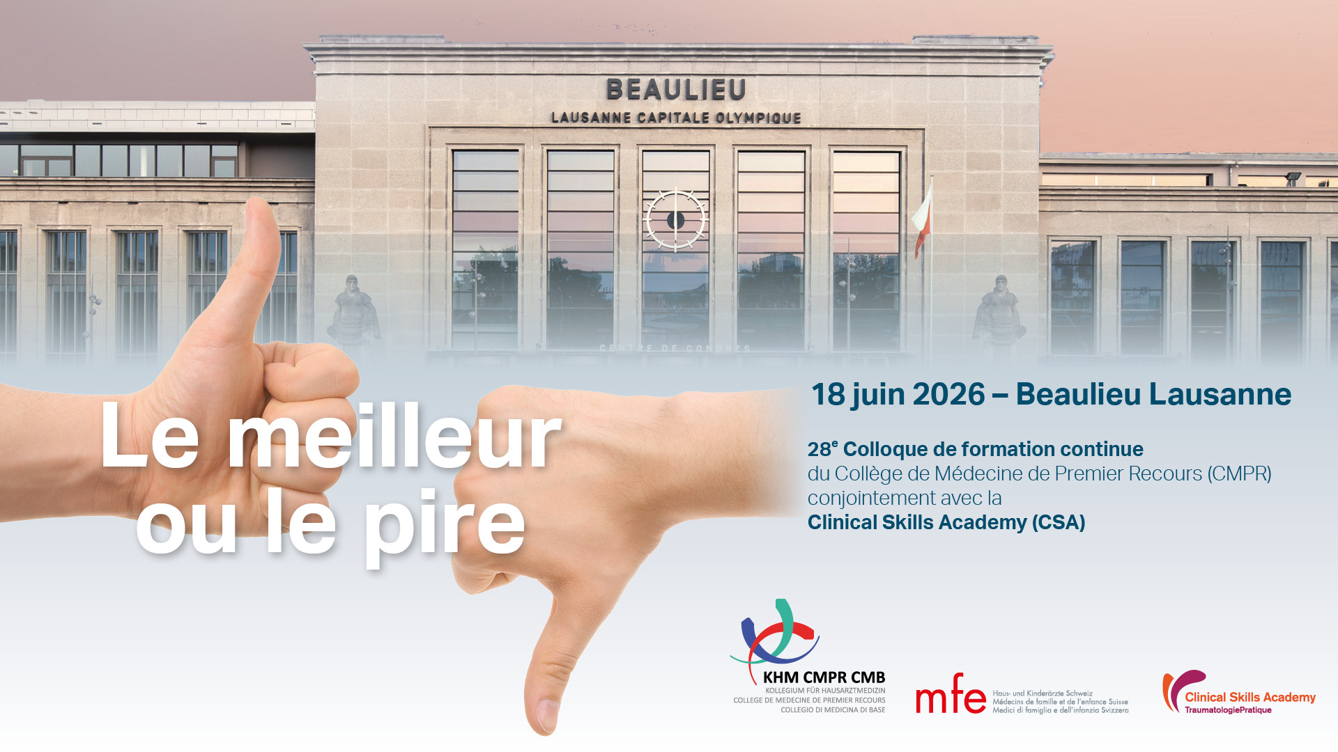 Bienvenue à l’édition 2026 de notre congrès ! Nous sommes heureux de vous annoncer la tenue du 28e Colloque du CMPR, organisé en partenariat avec la Clinical Skills Academy (CSA), le 18 juin 2026 au Palais Beaulieu de Lausanne. Sur le site, vous trouverez toutes les informations concernant l’un des principaux rendez-vous de formation continue pour les médecins de famille et les pédiatres de Suisse romande. « Le meilleur ou le pire » – À travers cette thématique forte, nous vous invitons à réfléchir aux contrastes qui jalonnent notre quotidien médical : entre intervention et abstention, innovation et continuité, complexité et simplicité. Cette 28e édition sera l’occasion d’examiner nos choix cliniques, notre rôle de médecin de premier recours et les repères qui guident notre pratique. Notre objectif : vous proposer un programme stimulant, qui favorise la réflexion critique, encourage les échanges interdisciplinaires et alimente une pratique toujours plus pertinente, humaine et durable.