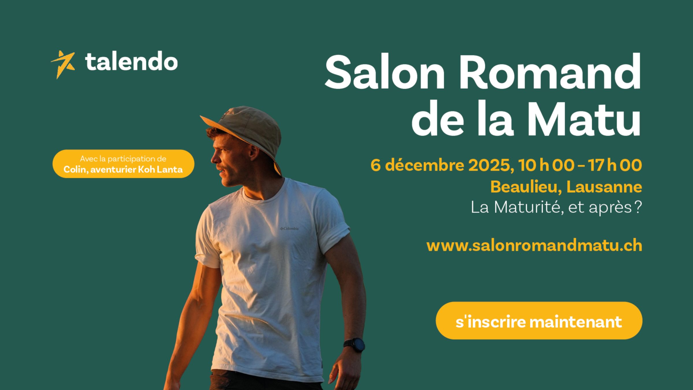 The Salon Romand de la Matu is an event dedicated to students completing their maturité who are exploring their future options. It brings together universities, companies, and institutions presenting their programs, professions, and opportunities. Visitors can benefit from personalized career advice, professional application photos, and inspiring conferences. For the 2025 edition, Colin Mottas from Koh Lanta will be attending the event to share his personal journey. The event offers a unique space for exchange and discovery, helping each young person find their path — whether through studies, internships, or a first job. Free entry, registration required.